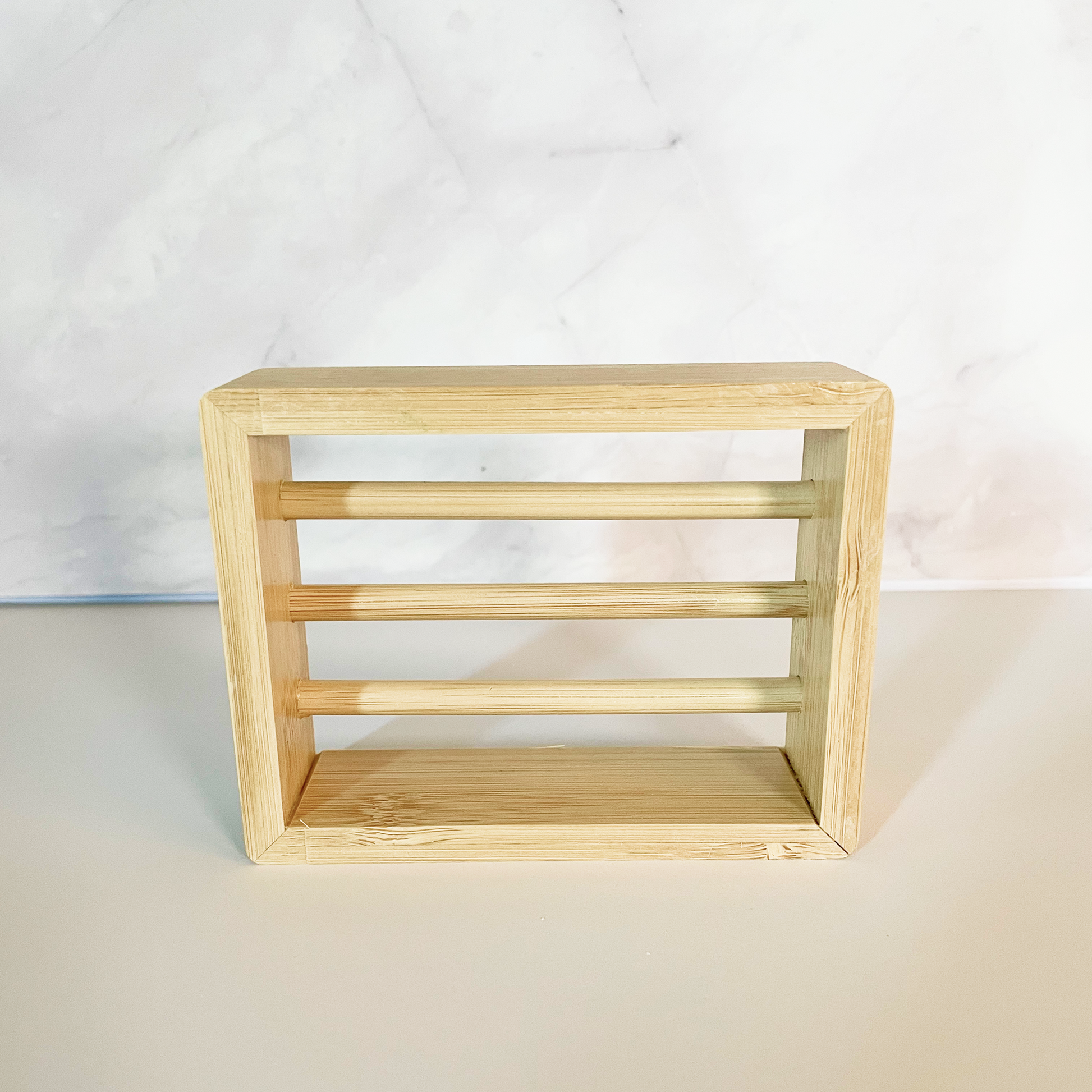 Light-toned bamboo soap dish. Place in an area where it can drain or elevate to keep out of standing water. Bamboo naturally biodegrades and can be composted when it is worn.
